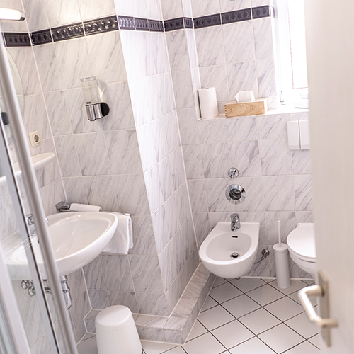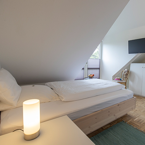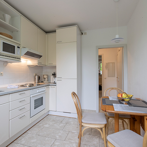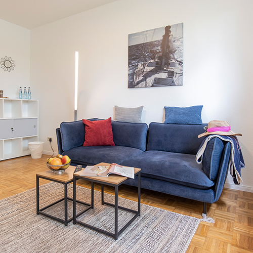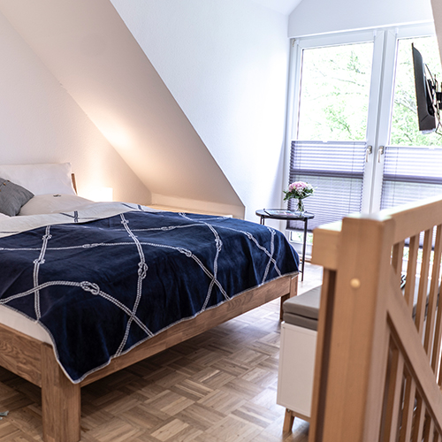 Unsere großen Apartments im 1. OG mit einer Gesamtgröße von etwa 65 m² erstrecken sich über zwei Etagen. Sie verfügen über ein Schlafzimmer mit einem Doppelbett, 180 x 200 cm, und ein weiteres Schlafzimmer mit einem Bett, 140 x 200 cm bzw. zwei Einzelbetten, 90 x 200 cm, einem Wohnzimmer, eine voll ausgestattete Küche sowie ein Duschbad und ein Gäste WC.